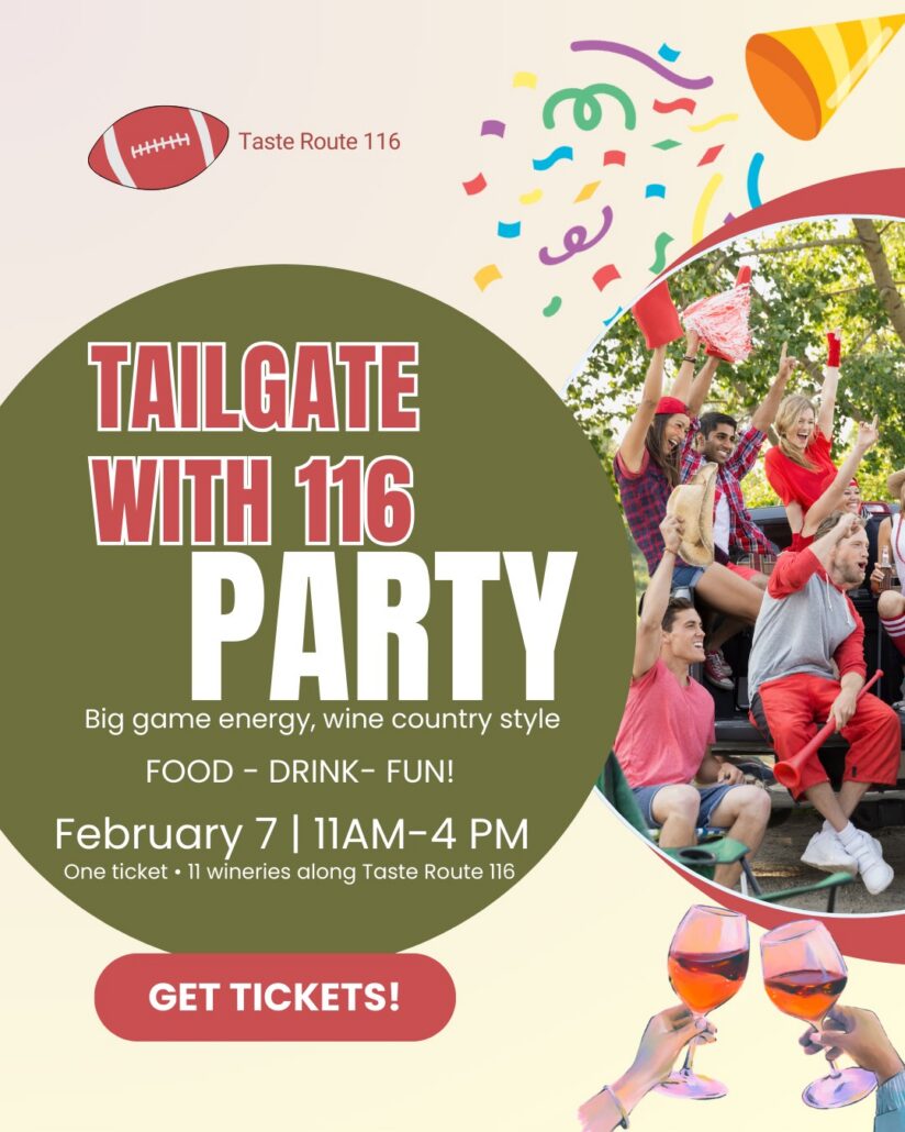 Tailgate with Taste Route 116 features 11 local West Sonoma County wineries, each pouring wines alongside tailgate-inspired bites. Start wherever you like and make your way through the day at your own pace.